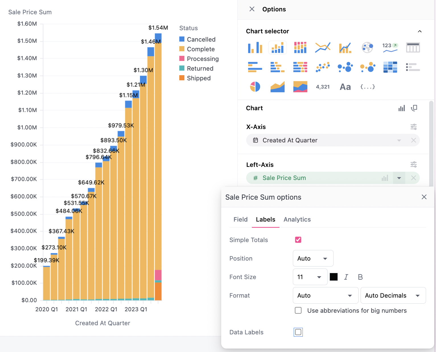For color-by stacked charts, totals can be labeled under the y-axis series configuration (Series > Labels > Simple Totals). Right now totals are not available for multiple-measure stacks. Additional configuration is provided for styling and value formatting of the labels:- Positioning (Auto, Above, Below, Left, Right, Middle)