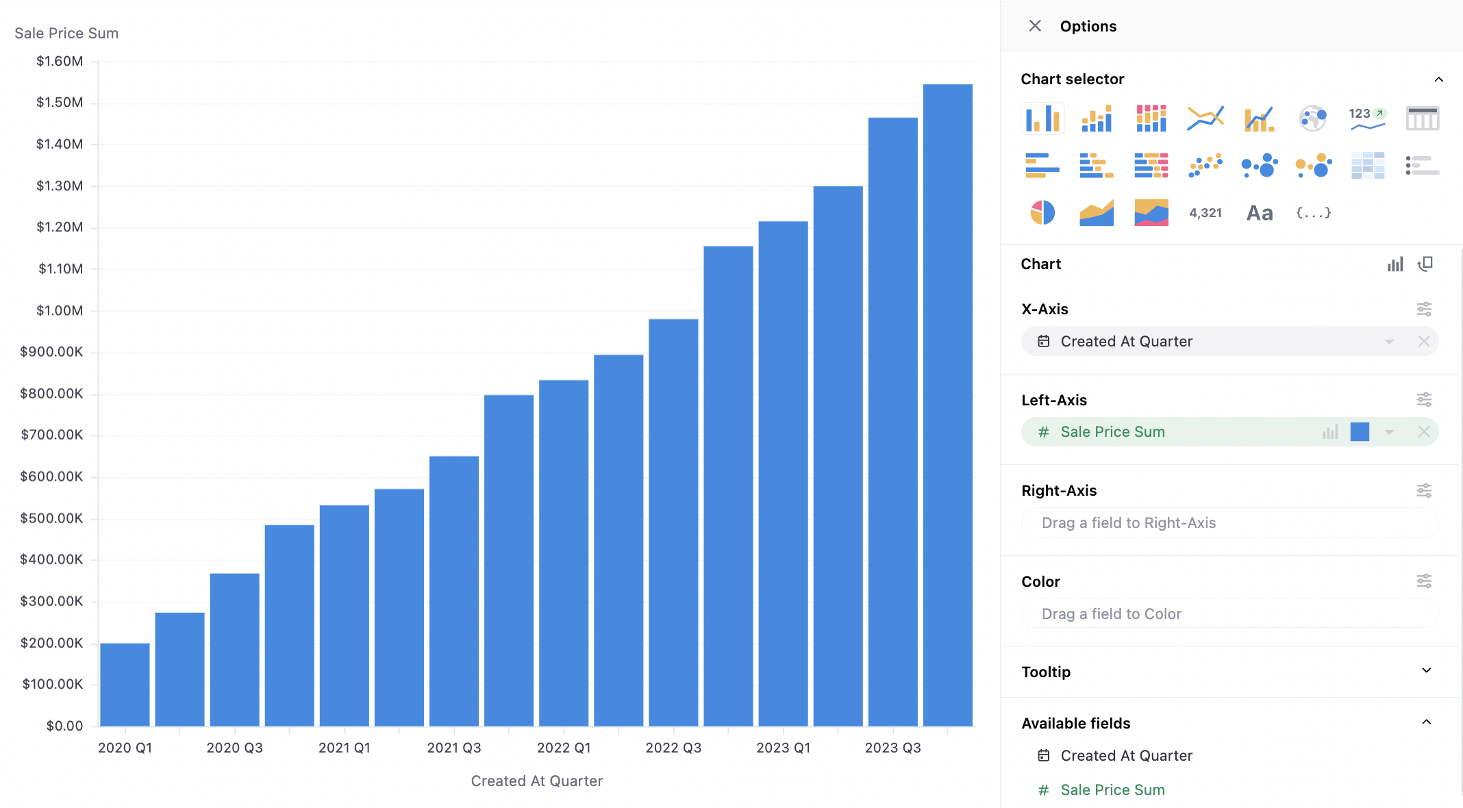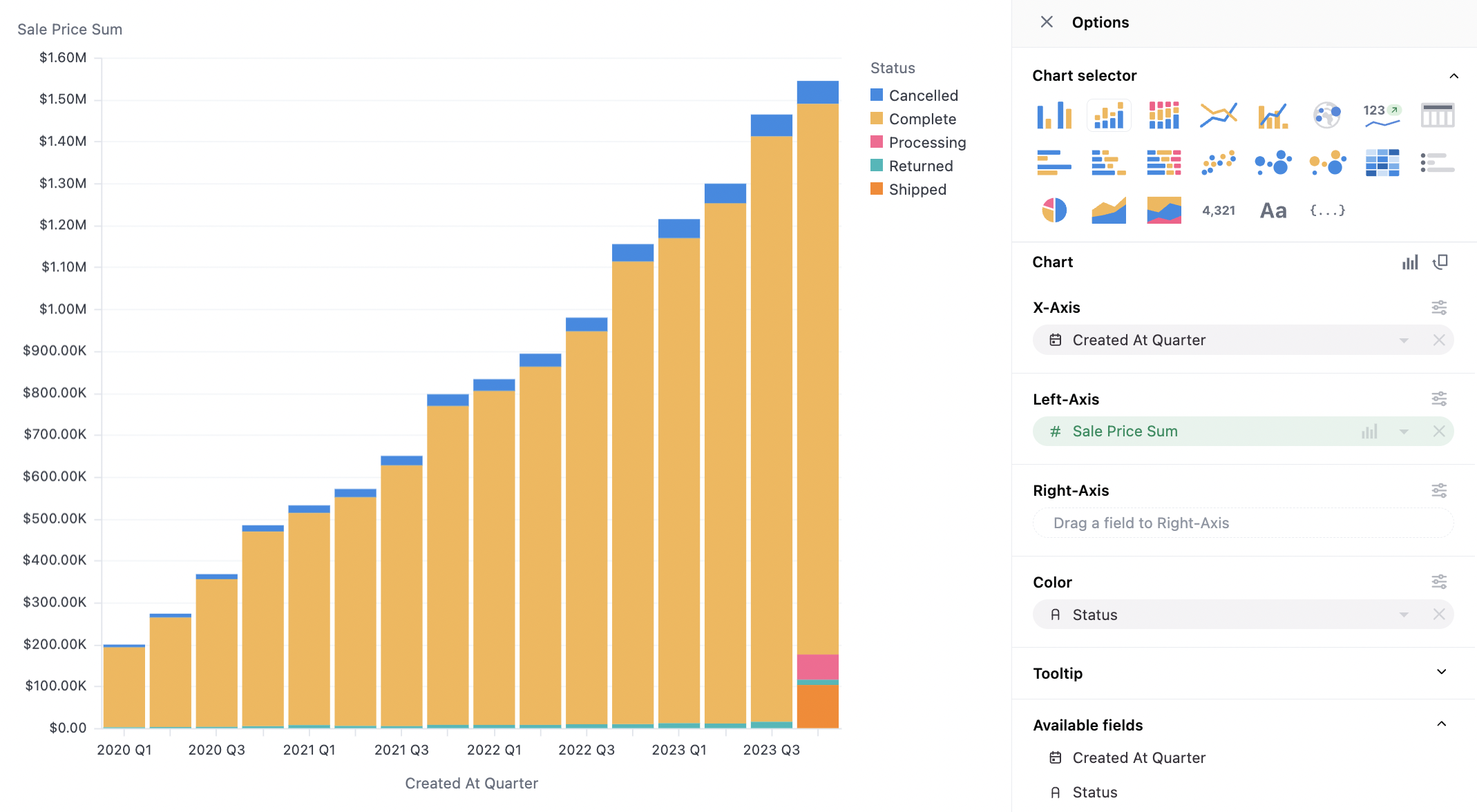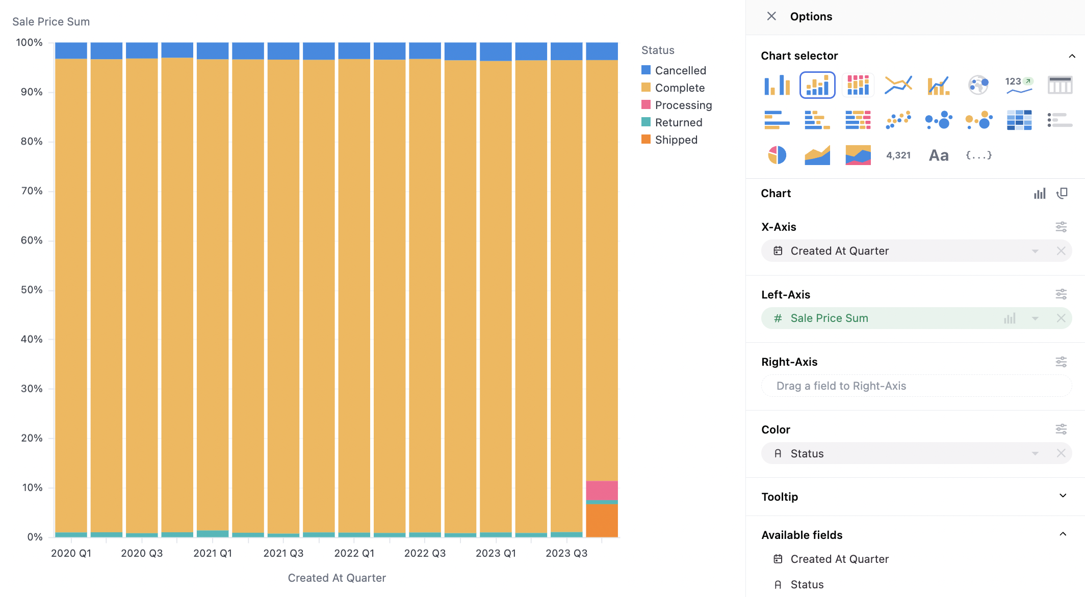 - Axes are set to ordinal with bars (vs temporal with line, scatter, and area charts). This means each bar will be labeled independently (not a continuous axis), the axes are not intelligent about time, and values that are not in the set will not be plotted. To fill missing rows, the data must be adjusted in the table - more here