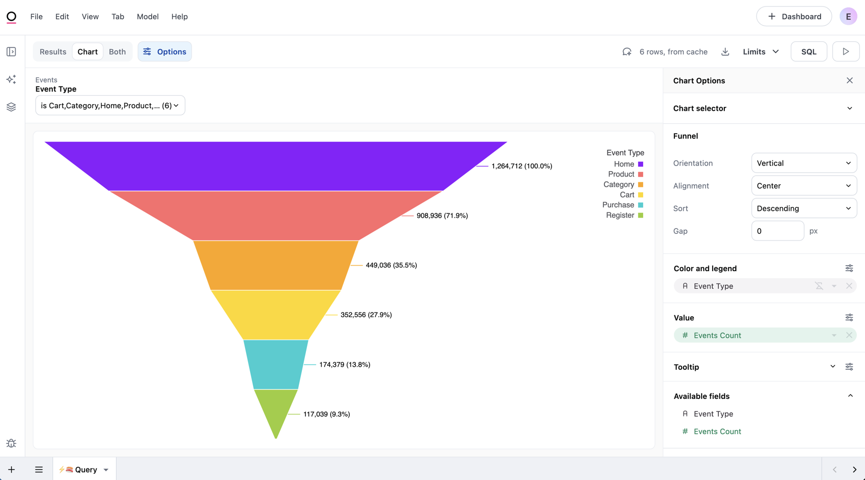 To view the configuration options for a funnel chart, open the Chart options panel in a workbook:
