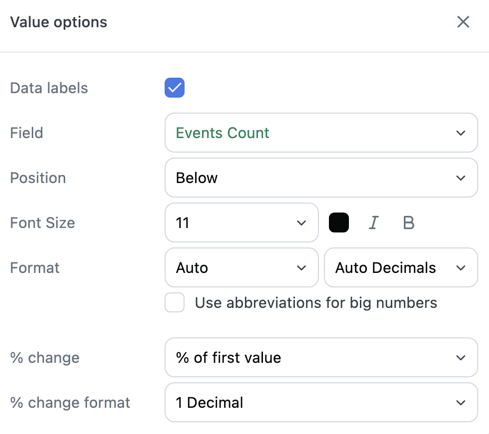 Toggle data labels to display stage names and values on the chart. Access the following label options by clicking the icon above the Color and legend and Value sections. Click the Data labels checkbox to enable label visibility, which will display some label configuration options: