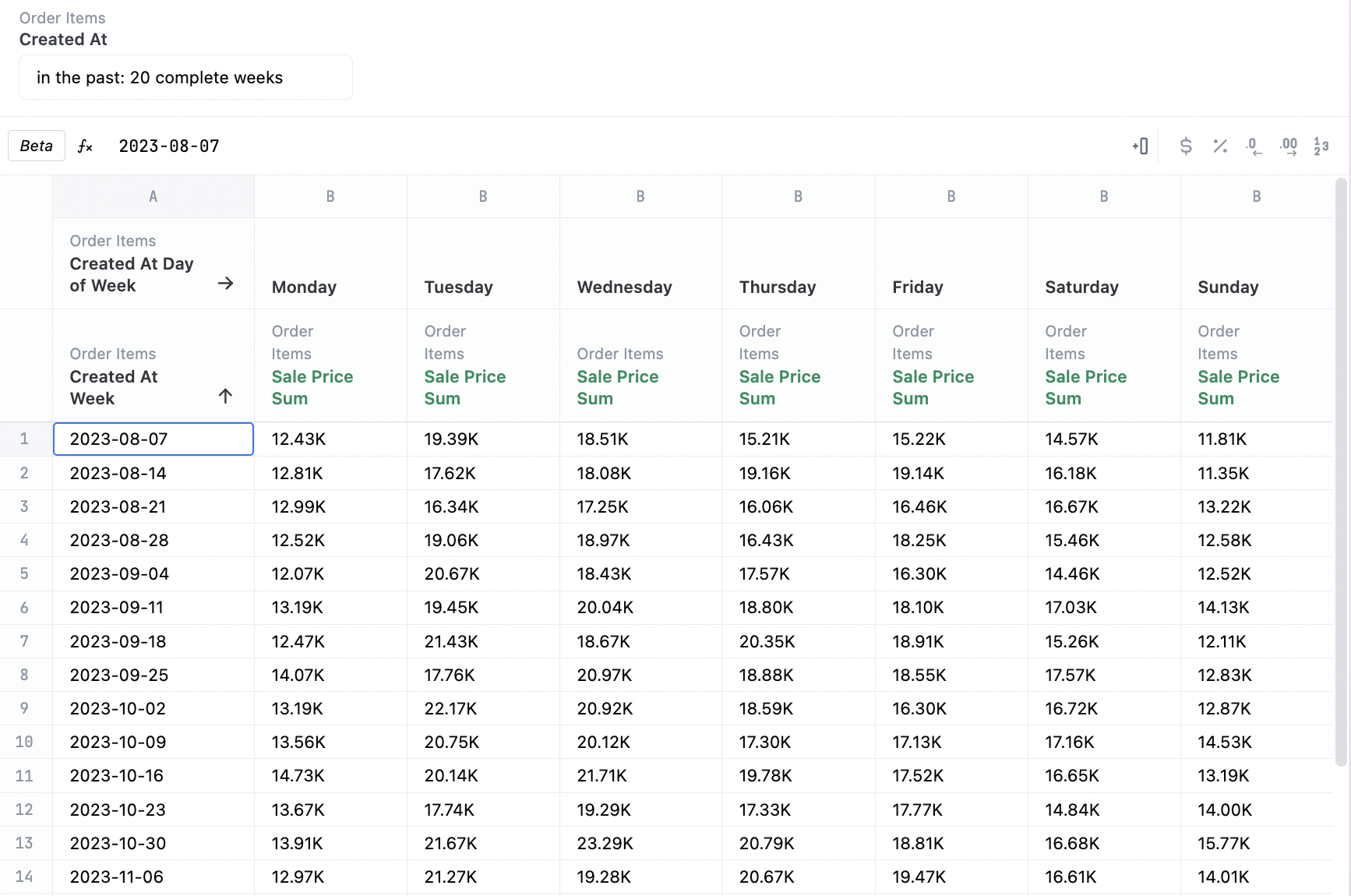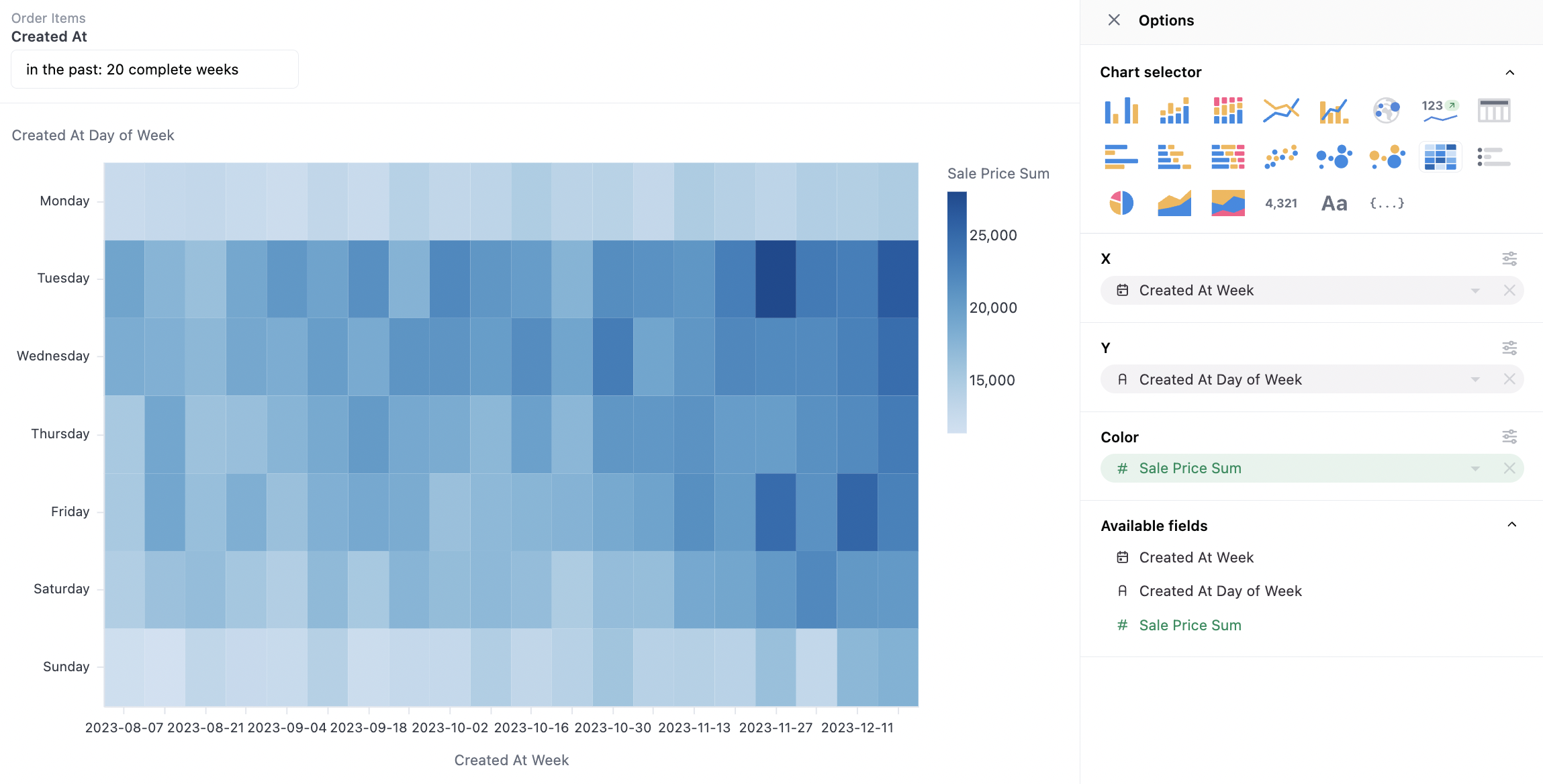 Bar charts can work with pivoted or unpivoted data, using 2 dimensions and one measure, or with all dimensions where there is a numeric available for the color facet. They often use two time facets, for example:date&hour_of_dayweek&day_of_weekmonth&year