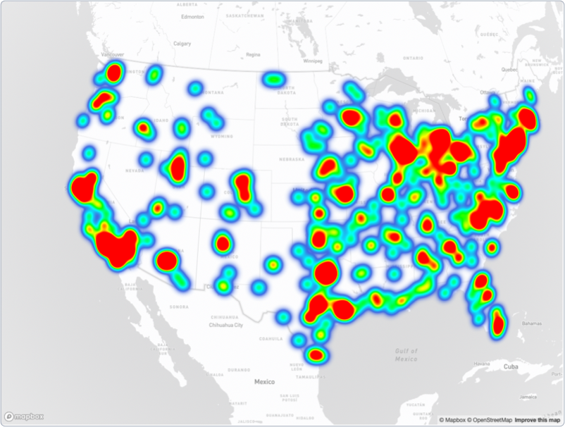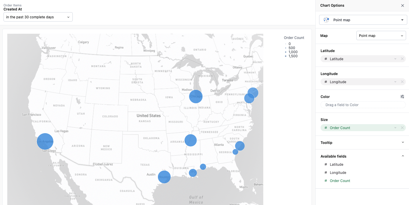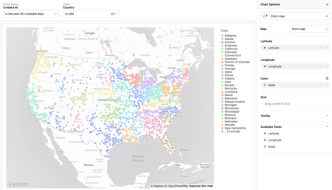 Data with latitude-longitude pairs can be visualized as a point map. Points can be sized and colored by additional properties in the dataset. Map with Color Pins