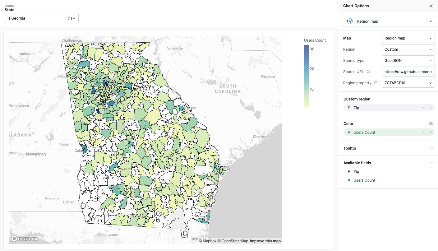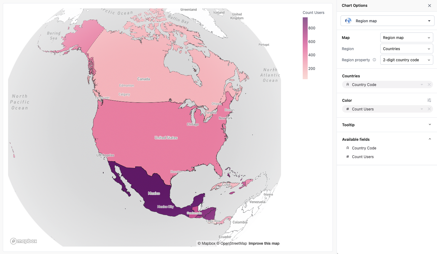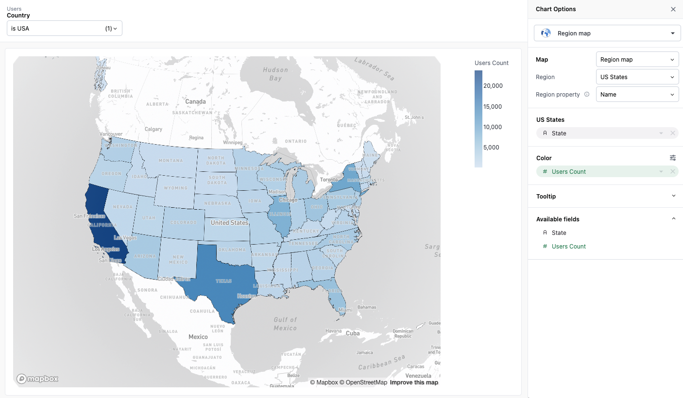 Data with region-based location information can be visualized as a region map. Omni offers region-based mappings for countries and US states out of the box, and offers a custom region option for greater flexibility.Built-in countries