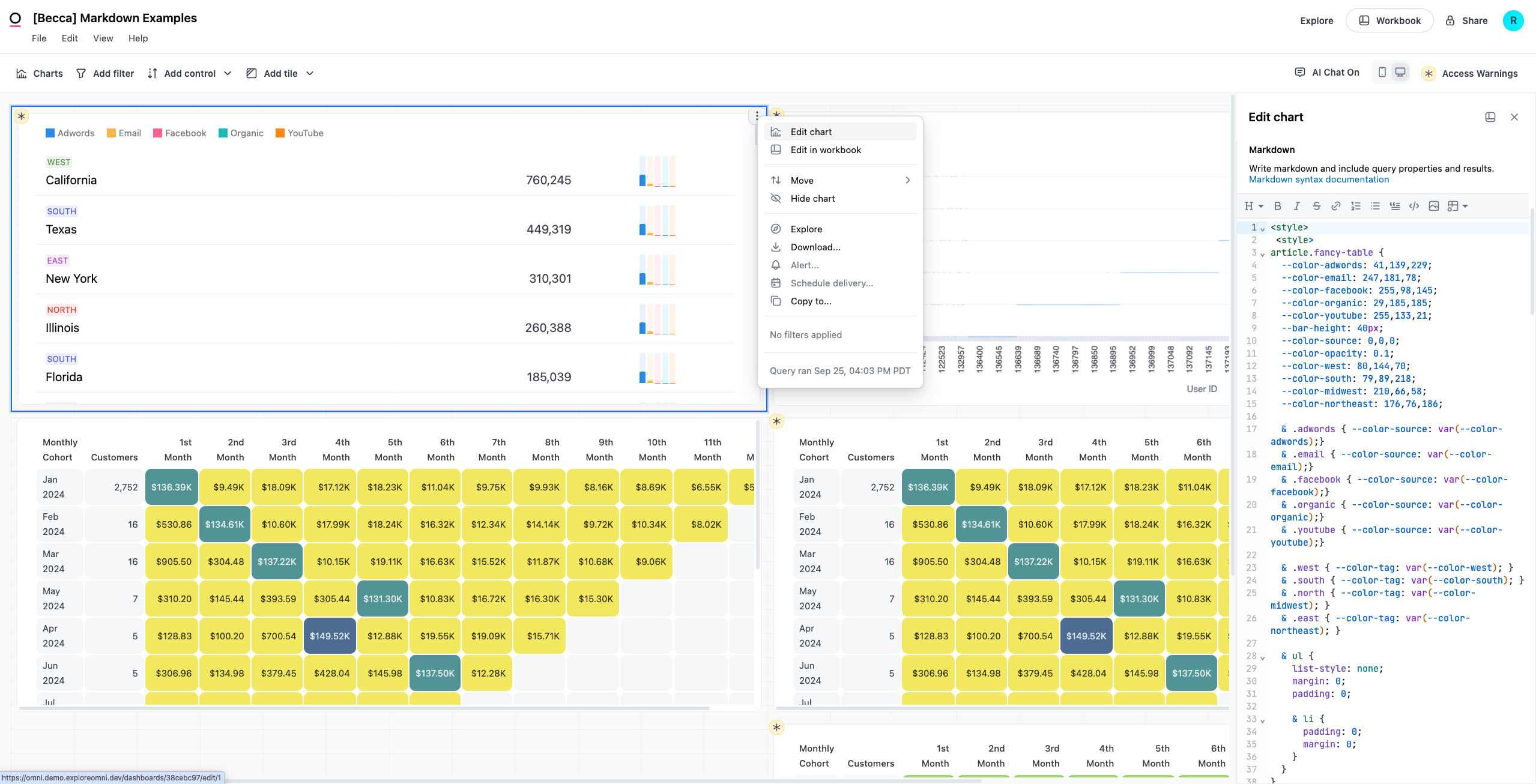 Using iframes in a Markdown visualization is also supported. iframes can be parameterized with query elements. By default, Omni applies restrictions (sandboxing) when rendering iframes. This means that some website features, such as popups, may be unavailable or incompatible. Use the dropdowns to check out some examples.Google Docs