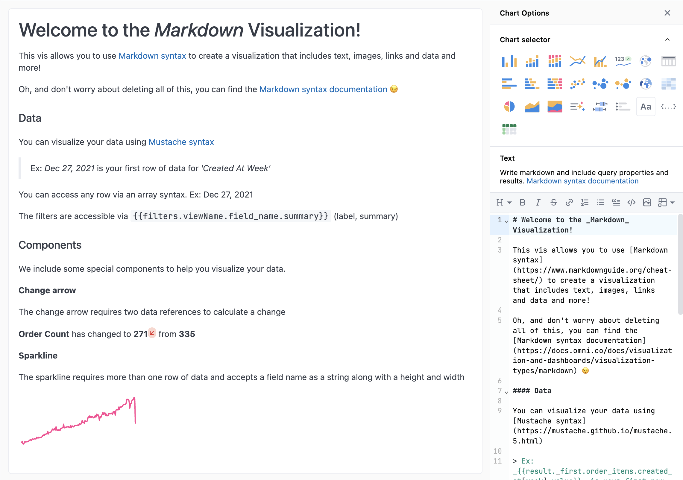 When you select Markdown as the visualization type, a Markdown editor will display in the chart’s Options pane. As changes are made, the chart area will automatically update. As you write, the chart area will update. At the top of the editor is a toolbar to help you generate correct Markdown syntax for common formatting actions.