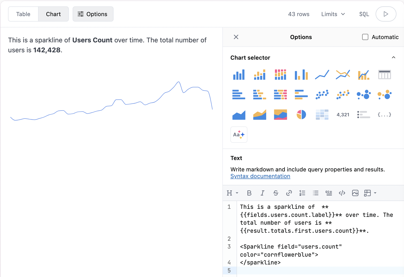 Adds a sparkline. Useful for seeing the shape in variation in a simple, condensed way. To use this component, your results must have more than one row of data and a field name.