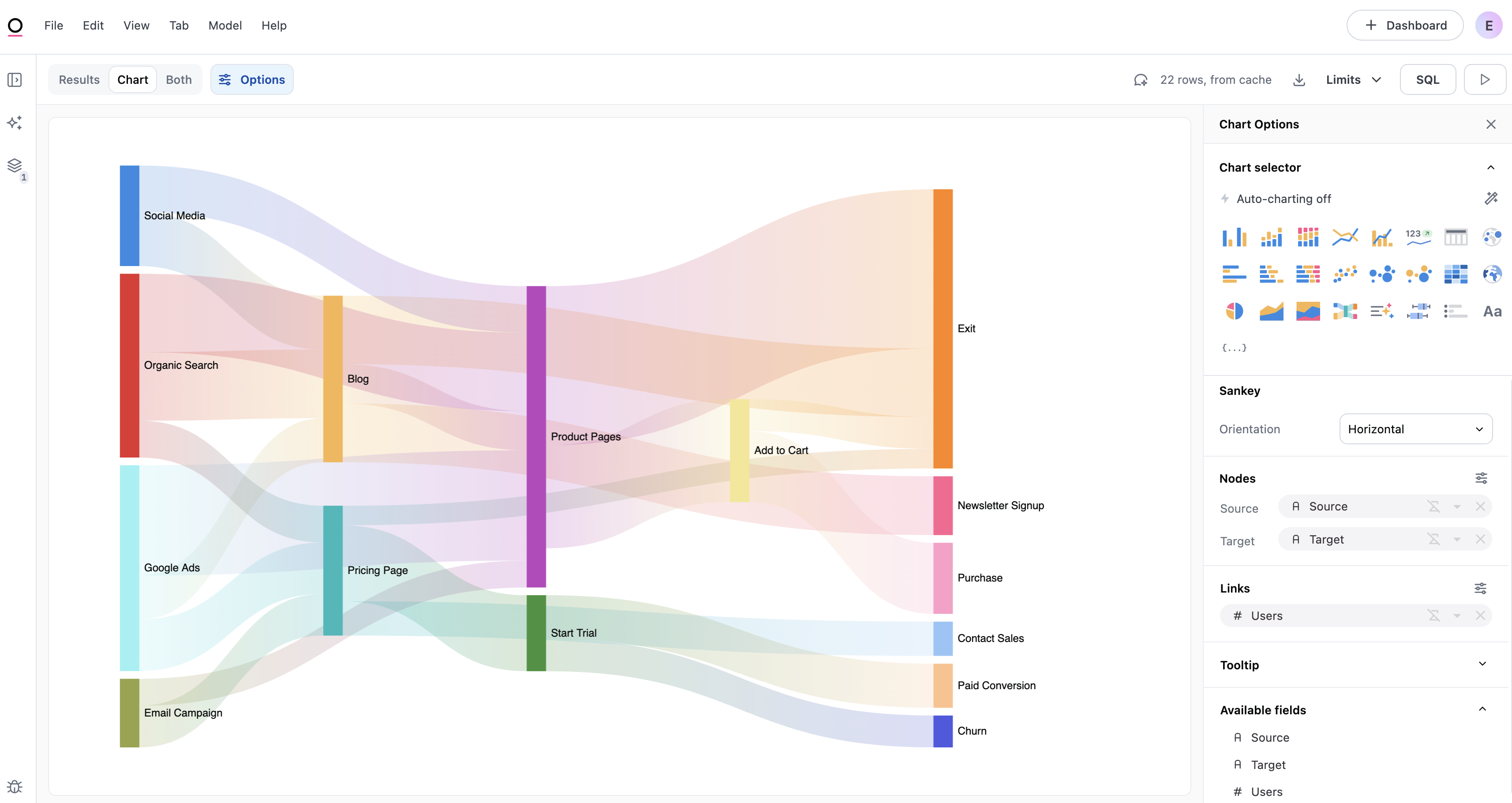 To view the configuration options for a sankey chart, open the Chart options panel in a workbook: