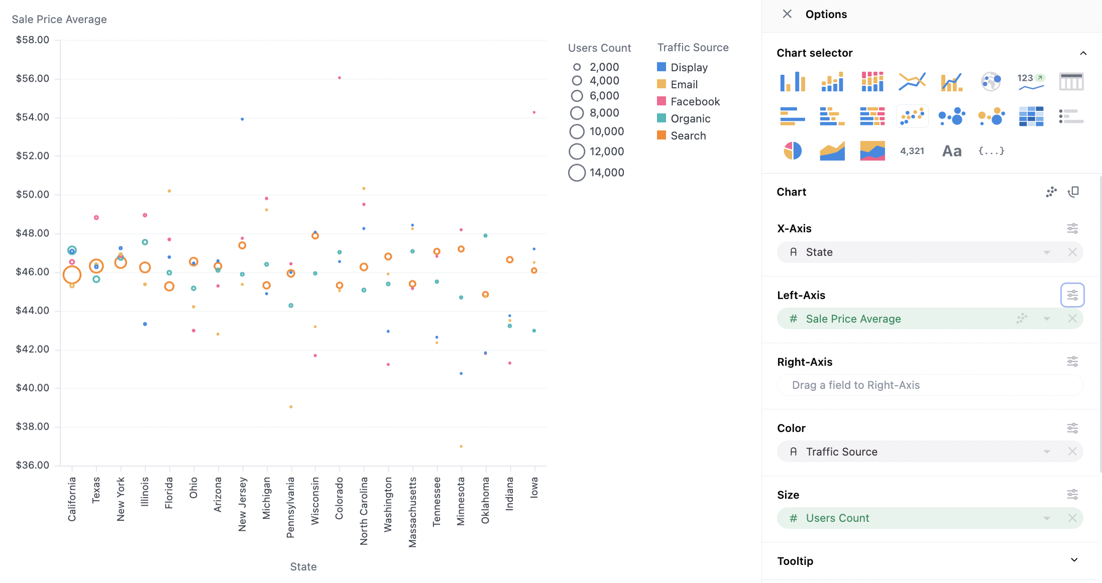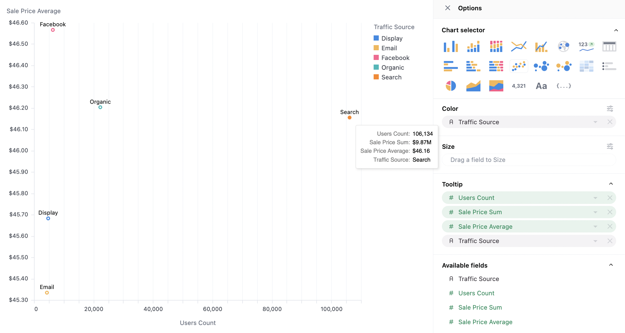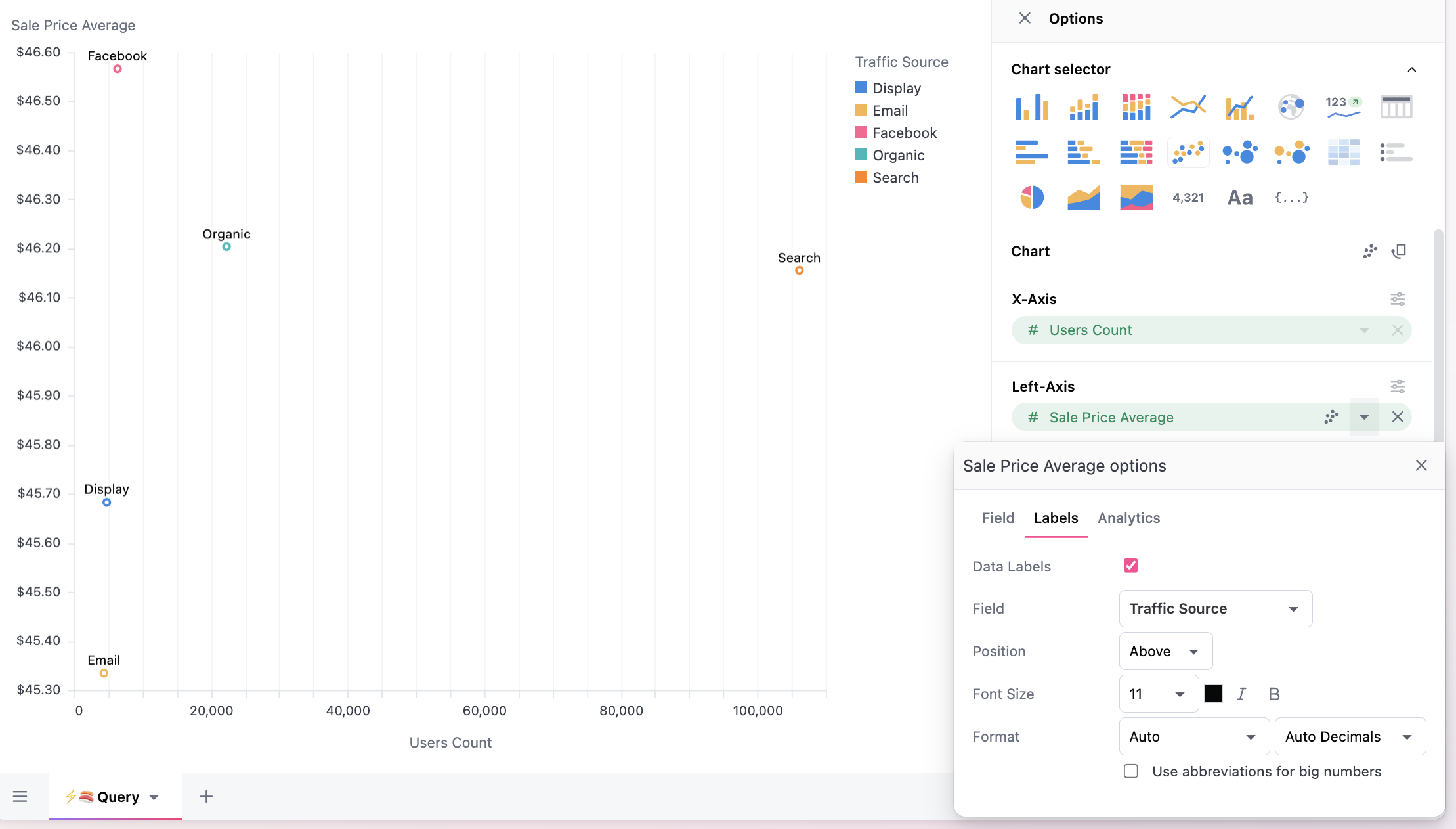 Scatter plots offer limited point-specific configuration, but often desire labels on the points. Series labels are configured from the Y-Axis menu (see below), and can be mapped to other series in the results table (often the dimension). For more complex labels, formulas/calculations can build alternative label options. Here we map the dimension (Traffic Source) into our series (Sales Price Average), note `Traffic source is also on color here, hence the legend, but that is not required:
