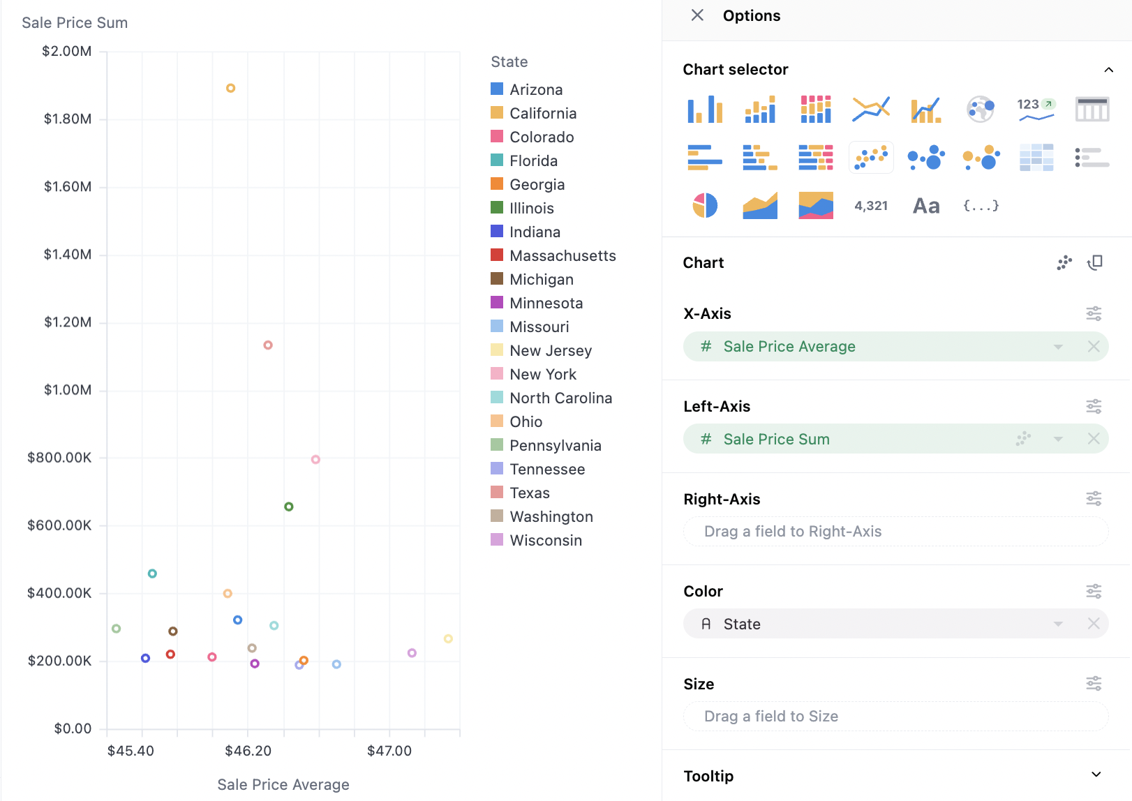 Tooltip control is another frequent need for scatterplots. To configure which dimensions or measures are in the tooltip, they can be dragged to the tooltip section, and are shown in the order listed.