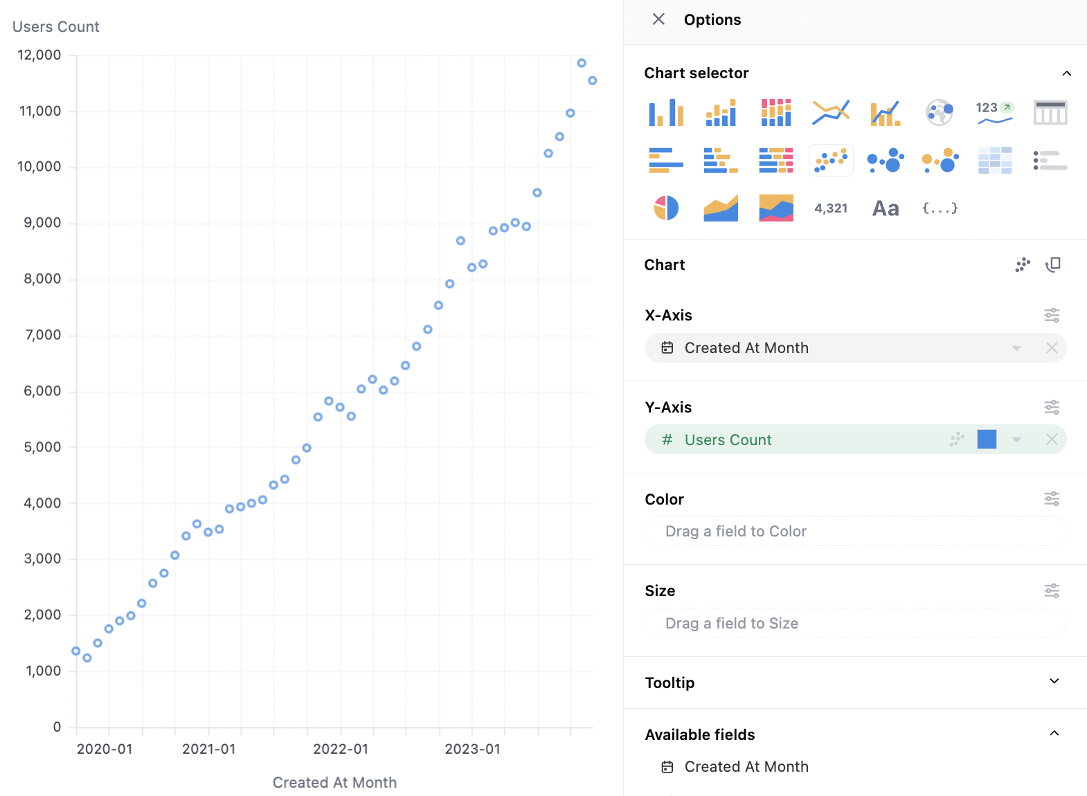 Scatterplots can work with pivoted or unpivoted data. To layer in color or size, simply drag a series onto the optional facets. Note that color will behave differently for numerics (where color will be plotted as a continuous variable) or strings (where color is plotted as an ordinal). For numerics, the behavior can be toggled under color > type.Scatter Configuration Notes