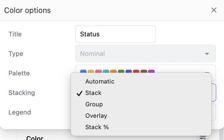 The color section controls overall stacking and grouping behavior overall, which is rarely important for scatterplots. Additionally stack can be set independently on the different y-axis, under the y-axis series configuration (useful for overall grouping of two stacked grouplets):- Automatic: we’ll guess for you