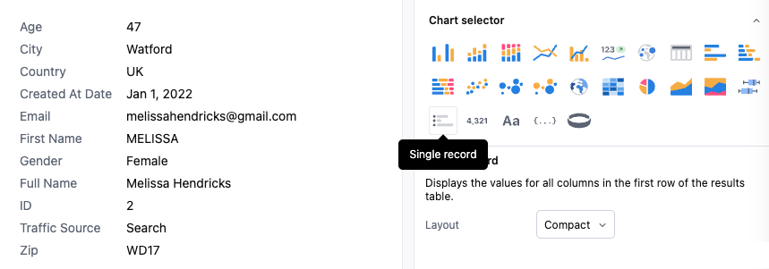Single record visualization offer a compact way to show a single row of data, pivoted to display the full row in a single column. If more than one row is present, the visualization will only show the top row. : Full table transpose is available in the table visualization options.