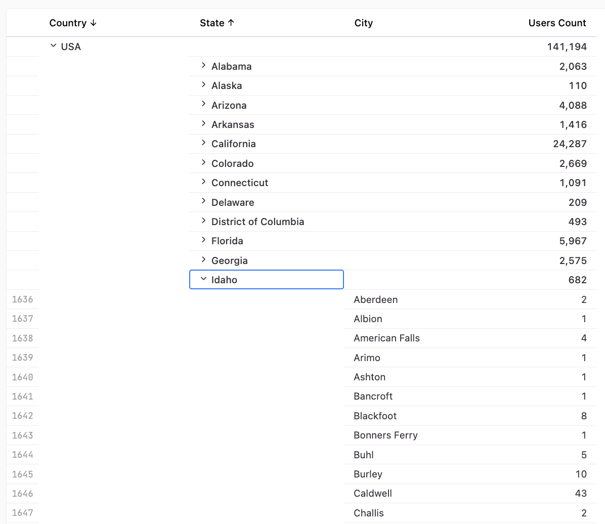 Group dimensions - If enabled and there’s more than one dimension per row, dimensions will be grouped into one expandable section. This allows you to subtotal datasets and increase interactivity in the table:
