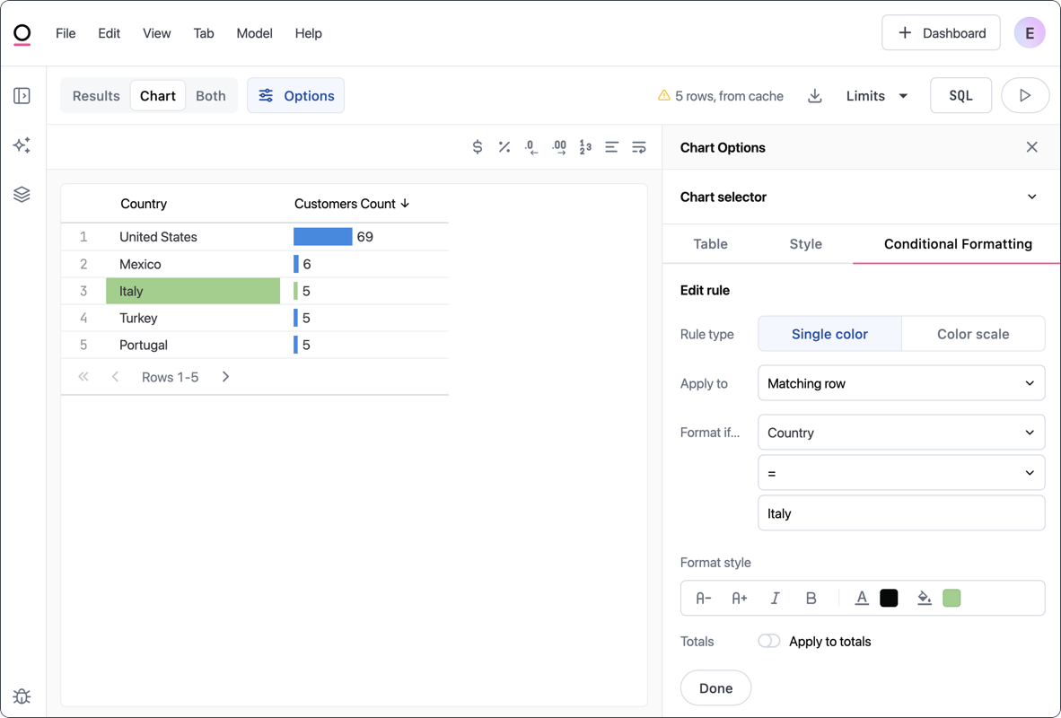 The Color scale tab allows you to conditionally apply gradients to table visualizations. Note: If you do not set amapping value, the color scale will apply across visible rows which may be confusing when row limits or pagination are active.