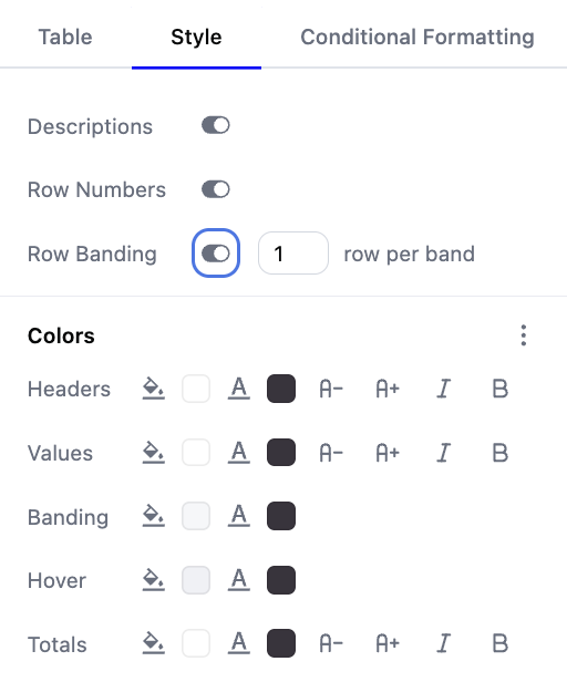 The Style tab allows you to adjust the look and feel of your table by making descriptions available, adding row numbers, banding rows, adjusting the font size, and text and background color of the various elements. Banding will set the rows to alternate between the base background table value color (white) and the base banding background color (grey). Font Size can be increased or decreased for Headers, Values, and Totals.